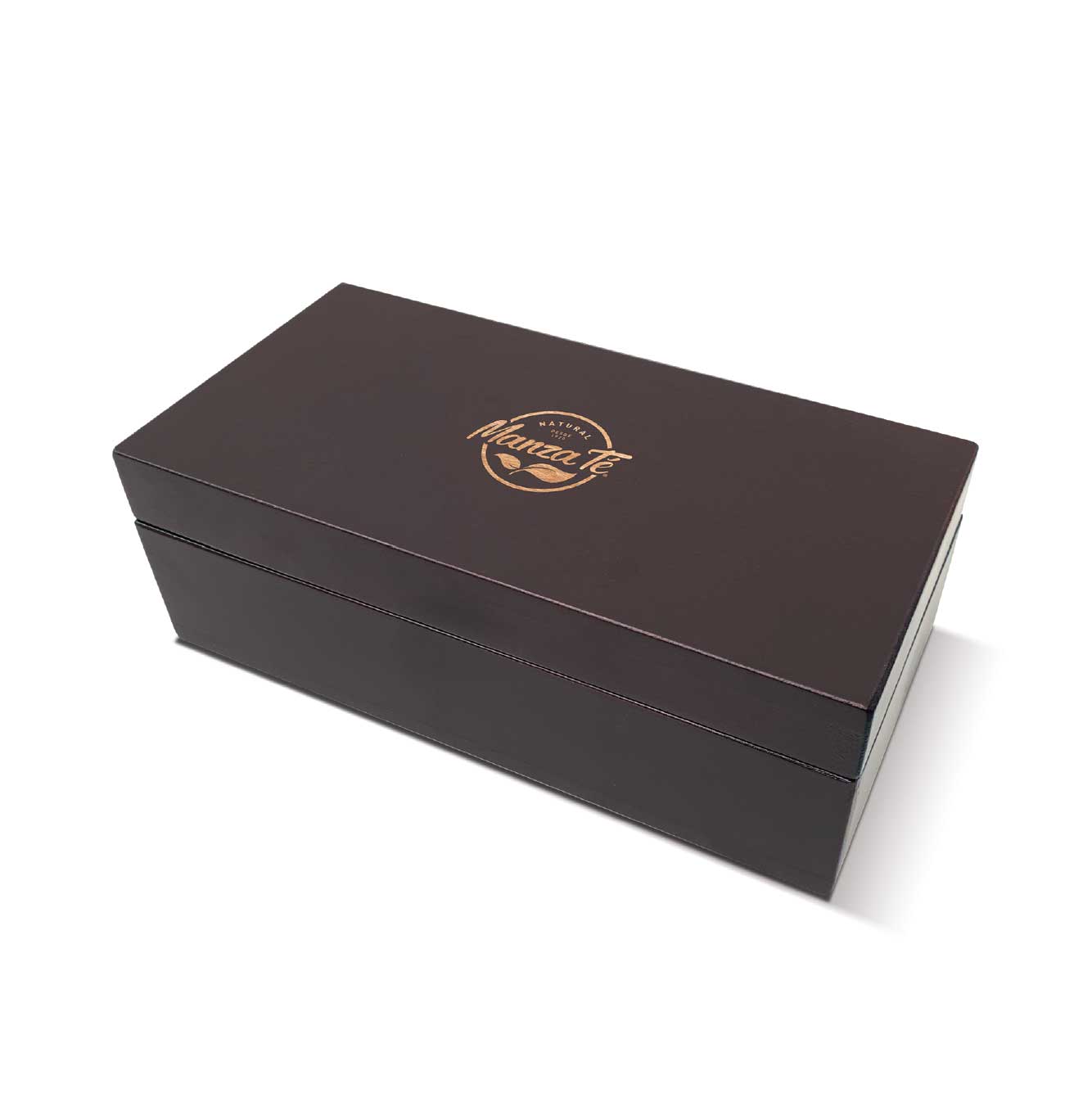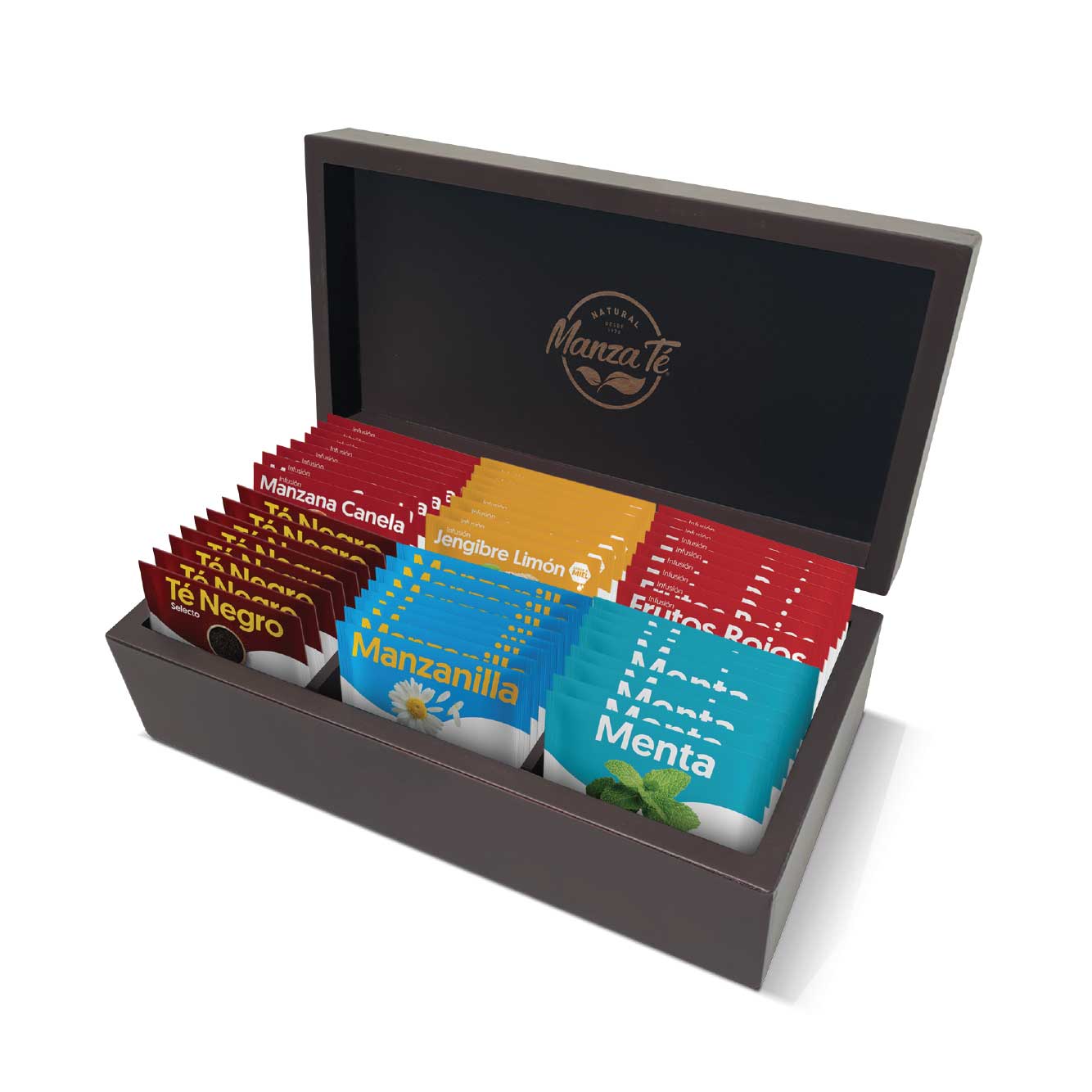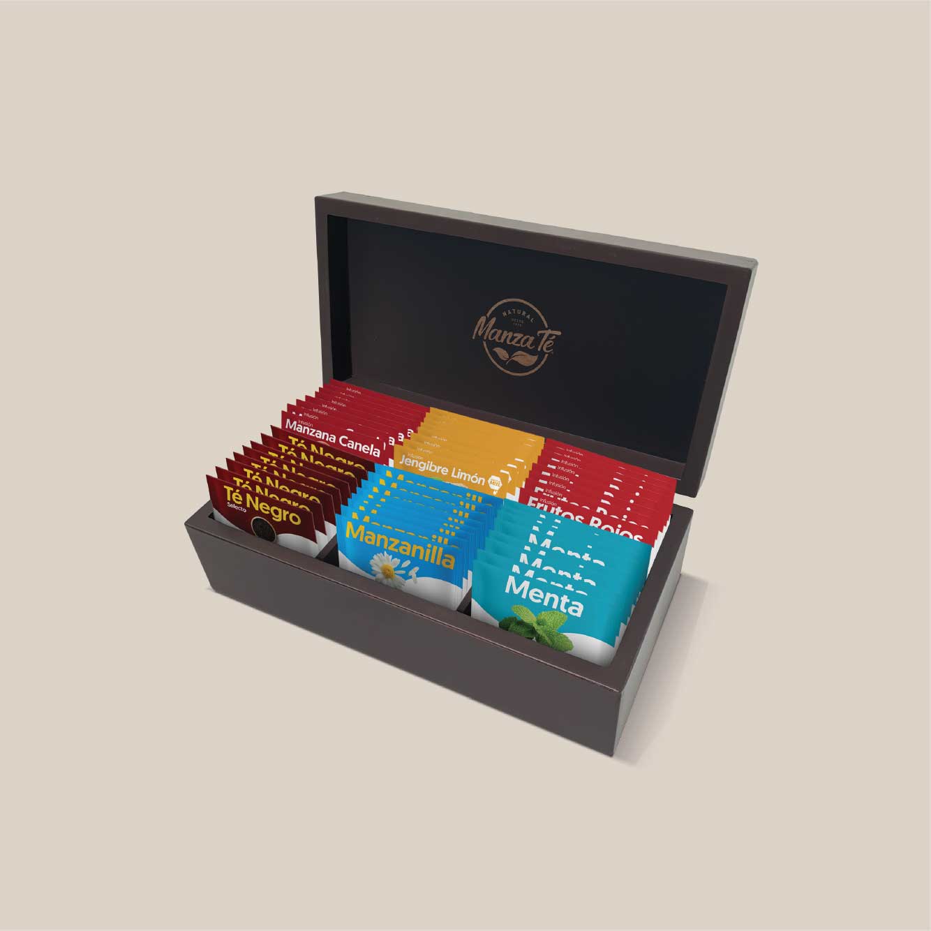 Cada cofre contiene una selección premium de tés e infusiones ManzaTé, elegidas para ofrecer un recorrido sensorial por distintas notas, aromas y momentos del día.